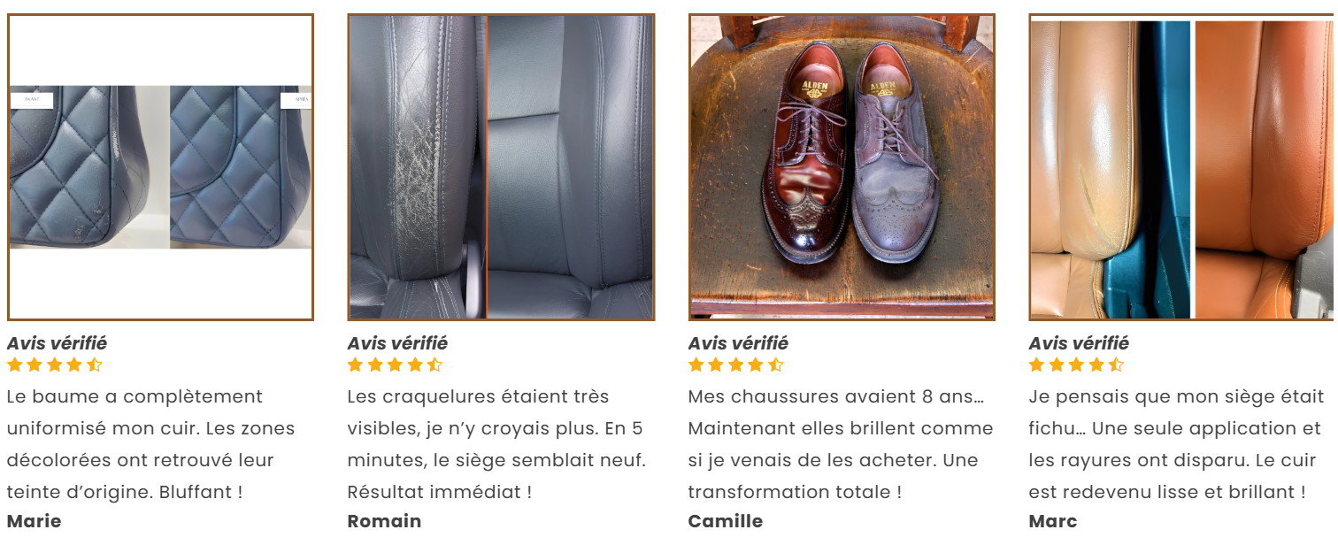 « Mon canapé était terne, sec, plein de marques… J'ai essayé ce baume par hasard et le résultat m’a choquée. En quelques minutes, le cuir est redevenu lumineux et les traces d’usure ont disparu ! » – Amandine