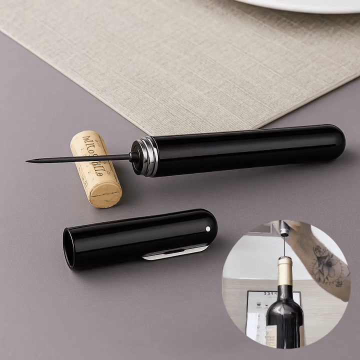 Grâce à son système à pression d’air, le bouchon sort doucement et proprement, sans tirer ni tordre. Aucun risque de casse, aucun résidu dans le vin. Le geste est fluide, précis et accessible à tous, même sans force dans les mains.