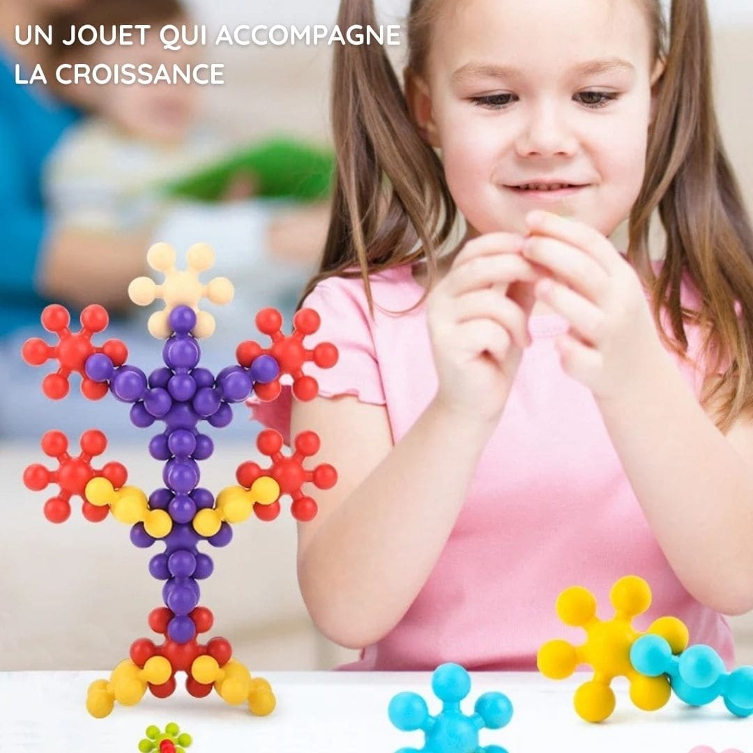 L’enfant peut créer des fleurs, animaux, tours, structures géométriques ou formes totalement inventées. Un vrai terrain de jeu pour l’imagination.