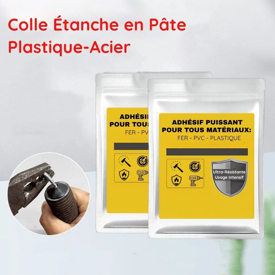 Cet adhésif métal‑plastique répond à votre besoin : il offre une solidité extrême, résiste à la chaleur et à l’humidité, et convient à de multiples usages (réparations de tuyaux, pièces automobiles, meubles, etc.).